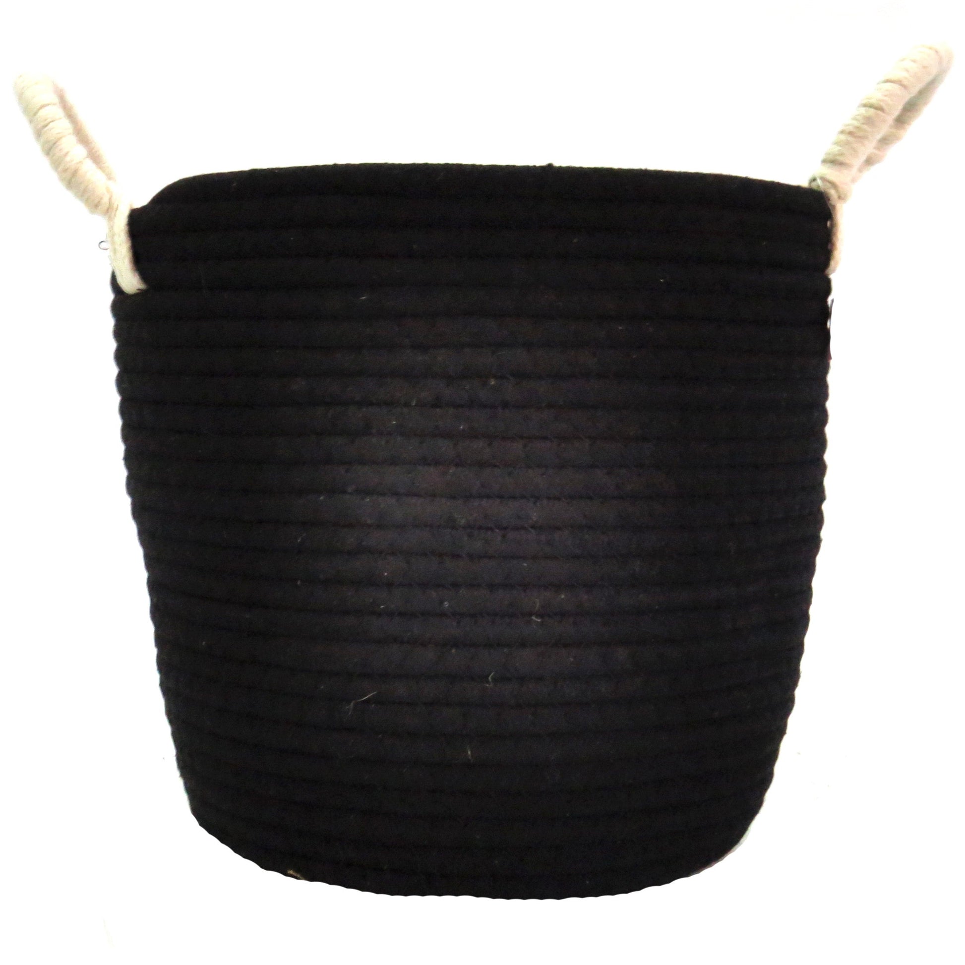 25cm x 25cm size does not include handles which are in crisp white which looks so good on this black cotton weave basket.