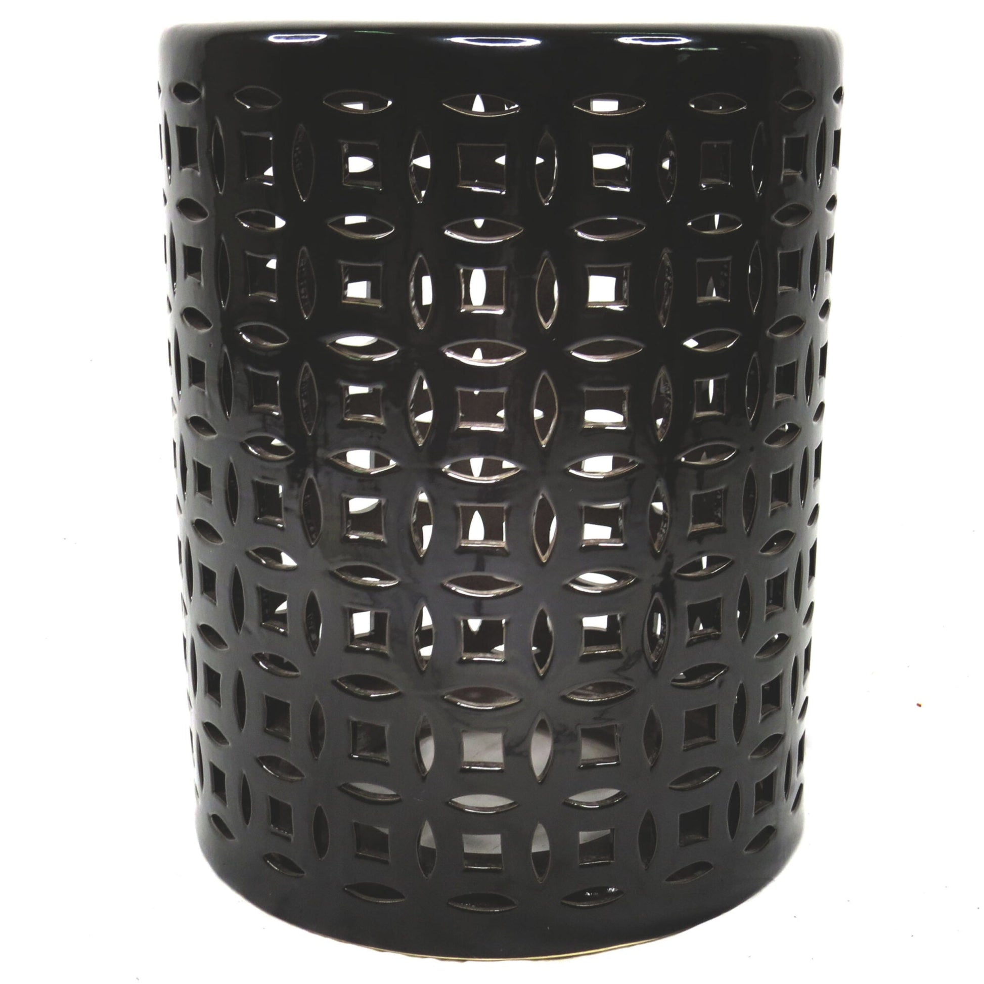 36.5cm(d) x 46cm(h) classic design, well weighted and heavy so it sits really well fabulous simple cut out design and beautiful glazed in black, plain top with simple cut out detail in the center top.